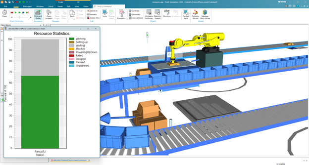 A Siemens Plant Simulation kiváló eszköz a gyártási és logisztikai folyamatok szimulációjára, és Fanuc robotok integrálásával lehetővé válik az anyagáramlás még pontosabb vizsgálata és optimalizálása.